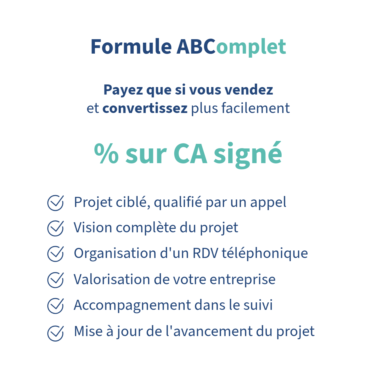 - Avec la formule ABComplet, le RDV téléphonique est organisé gratuitement. C’est la validation de la vente qui déclenchera une commission de 5% sur la valeur du bon de commande signé avec le client. Si la vente ne se réalise pas, aucune commission ou paiement sera dû.
