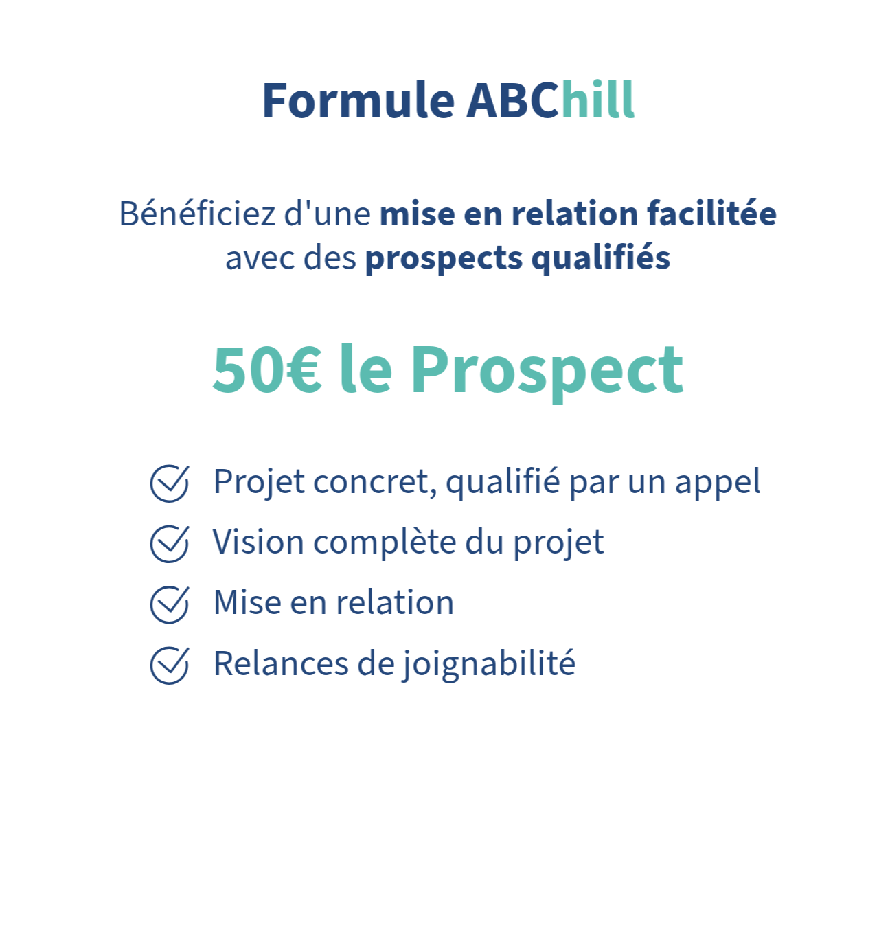 - Avec la formule ABChill, la mise en relation coûte 50€ HT payable à l’unité au moment de la validation de la mise en relation.
